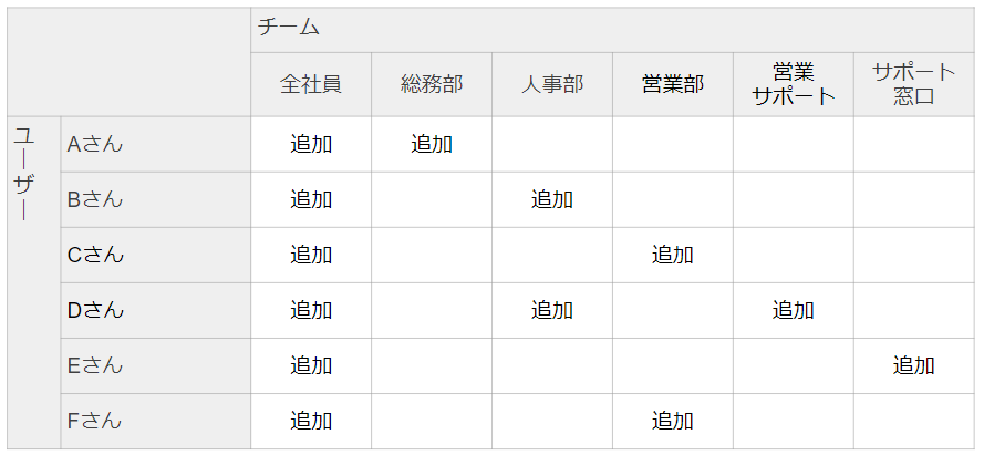 This makes it easy to see at a glance "which users" should be added to "which teams".