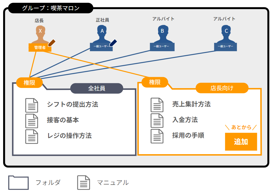 Initially, it's fine to start by making manuals available to all employees and gradually add folders as needed.
