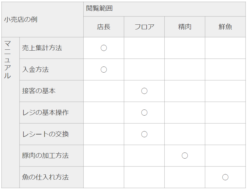 In this case, set "Manuals" as rows and "Viewing Scope" as columns, and mark with a ○ at intersection points where a specific department or person needs to view that manual.