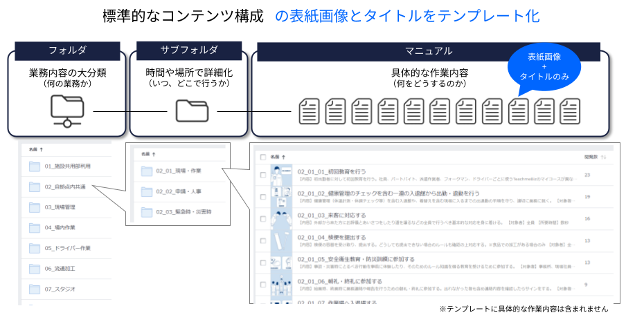 各業種の標準的なフォルダやマニュアルといったコンテンツ構成のセットを、貴社のTeachme Biz環境に作成します。