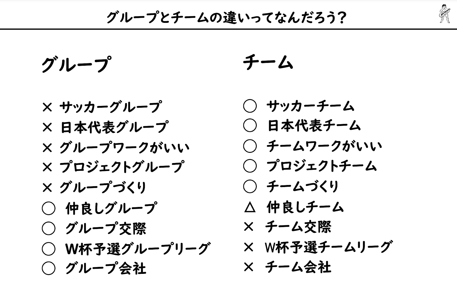 例として挙げると、「サッカーチーム」とは言いますが「サッカーグループ」とは言わないですよね。「日本代表チーム」とは言うけど、「日本代表グループ」とは言わない。