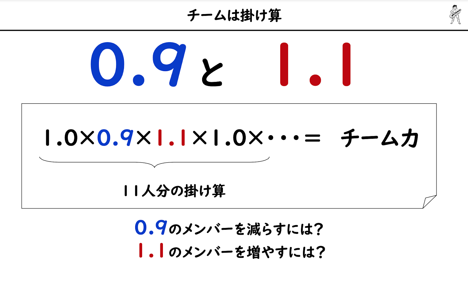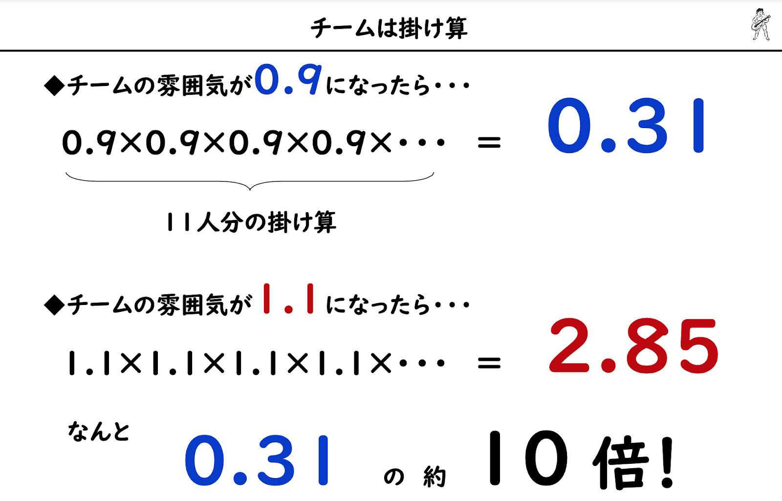 メンバーがもし11人だとして、0.9の人が11人いたら、解は0.31です。1.1の人が11人いれば、2.85になります。その差は約10倍です。心理的柔軟性の高い人たちが集まれば、これだけの差が出ます。