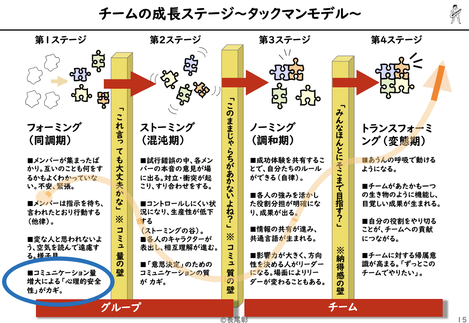 長尾:心理的安全性は、「仕事を成し遂げるうえで、言いたいことを自由に言い合える関係性がある」という状態です。エドモンドソンは、フォーミングの時期に、この心理的安全性を高めておくことが大事だと話しています。