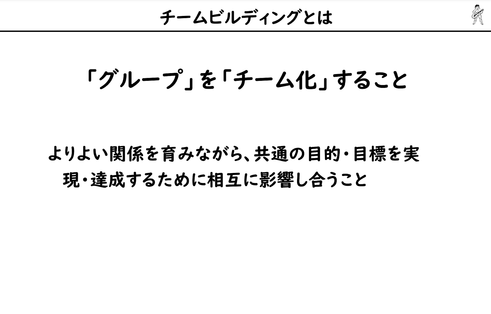 そして、この「グループ」を「チーム」に変えていくことが、「チームビルディング」です。より良い関係を育みながら、共通の目的・目標を達成するために相互に影響し合うことを、僕はチームビルディングと定義しています。
