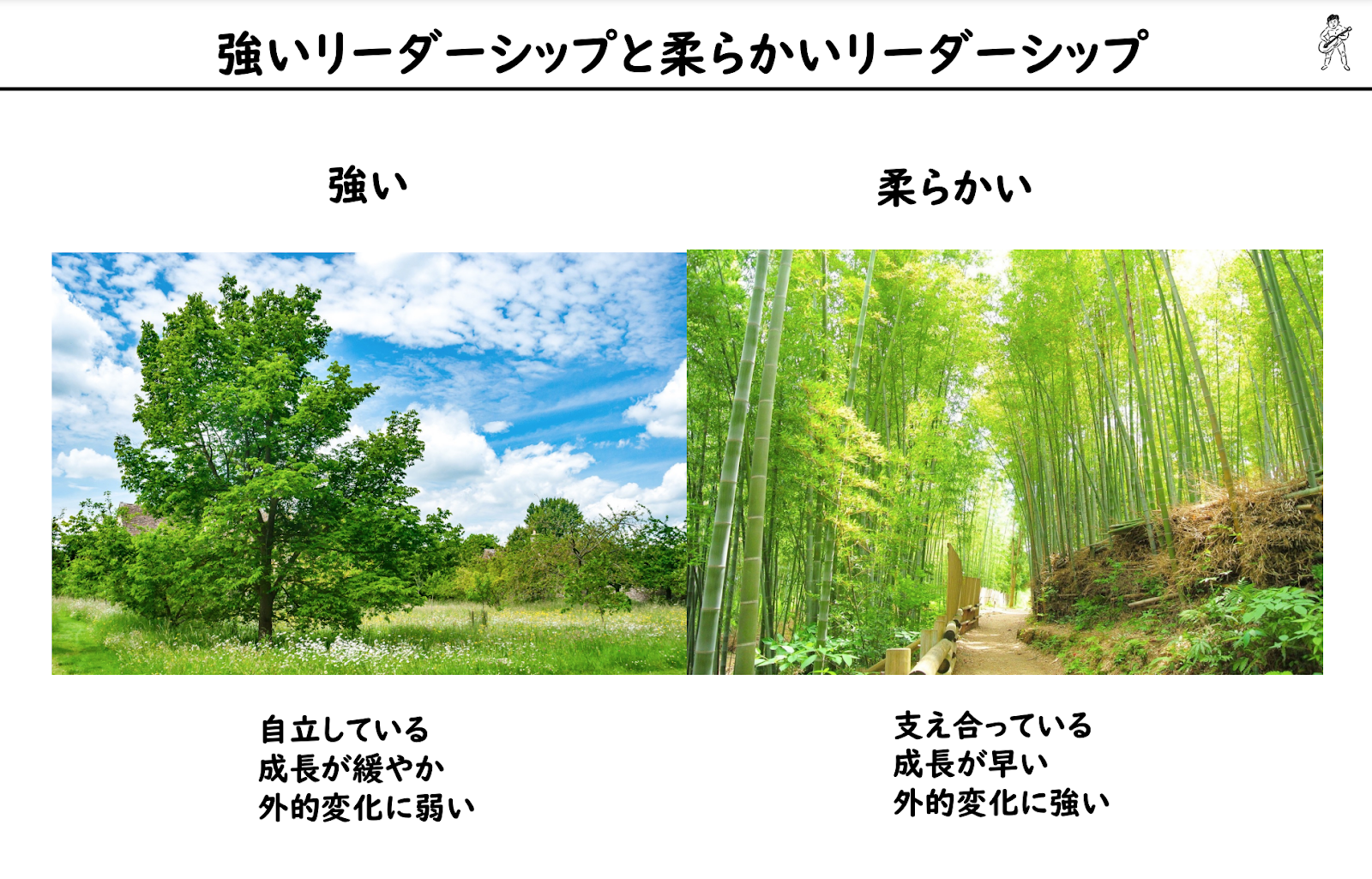 左側のヒエラルキー型組織であれば、強い木のような1本柱の通ったリーダーシップが求められるでしょう。右側のネットワーク型組織であれば、しなやかな竹のような柔らかいリーダーシップが必要かと思います。