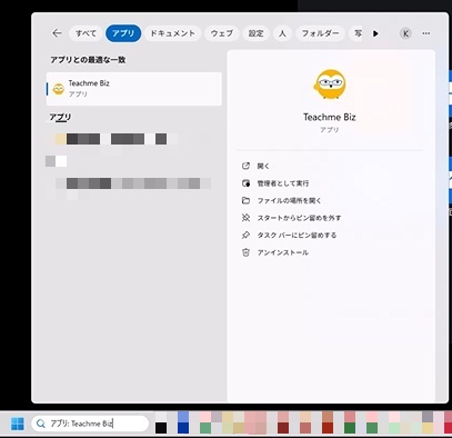 ChromeやEdgeで利用するWebブラウザ版ではなく、PCに「Teachme Biz」というアプリがインストールされていれば、それがWindows デスクトップアプリです。