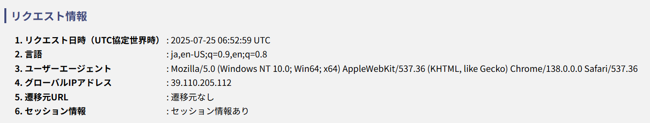 画像内のリクエスト情報>4.グローバルIPアドレス に記載されている数字が現在お使いのIPアドレスです。