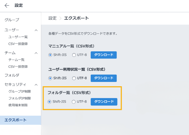 フォルダ利用状況一覧CSVのダウンロードについて