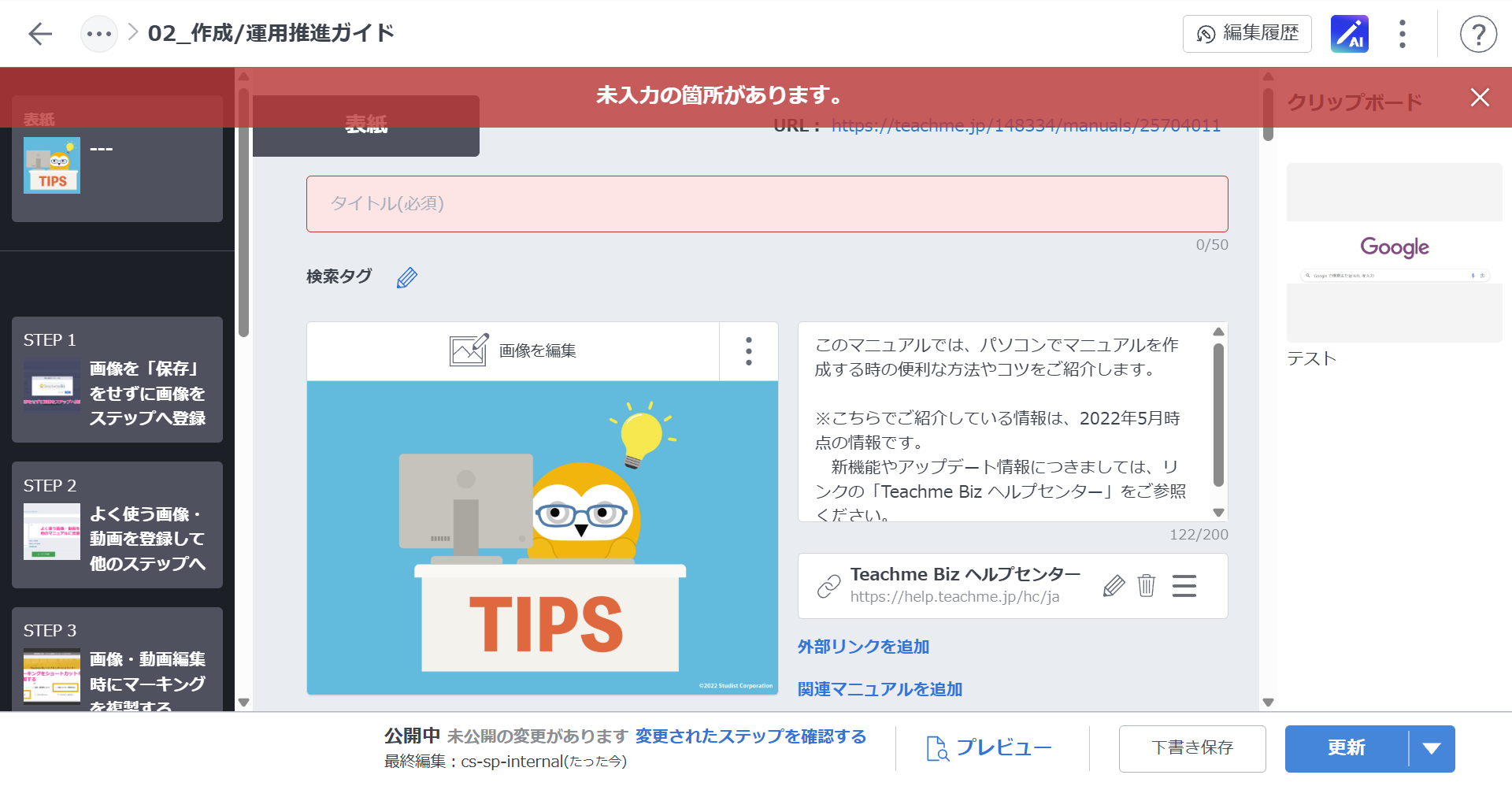 - 表紙とステップ、すべてにタイトルと、画像もしくは動画が登録されている